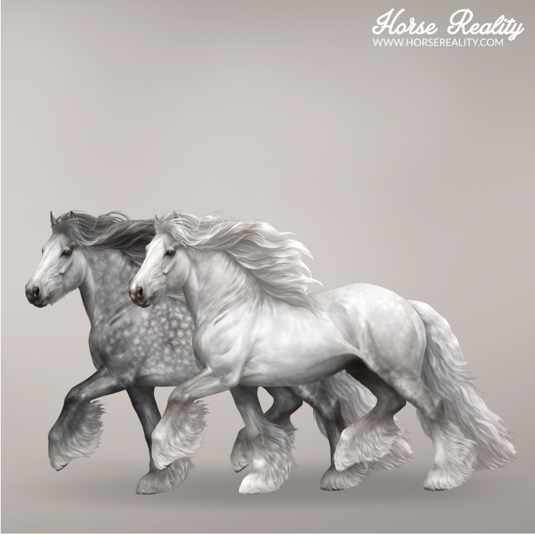 Grey (or gray) is a horse color caused by one or two copies of grey on any coat color. It causes progressive lightening (“greying”) of the coat.